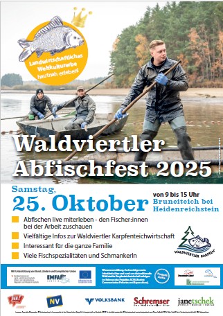 Seit 2015 findet das Waldviertler Abfischfest immer an einem Samstag Ende Oktober statt. Das heurige Abfischfest am Bruneiteich wird am Samstag, 25. Oktober 2025 stattfinden!